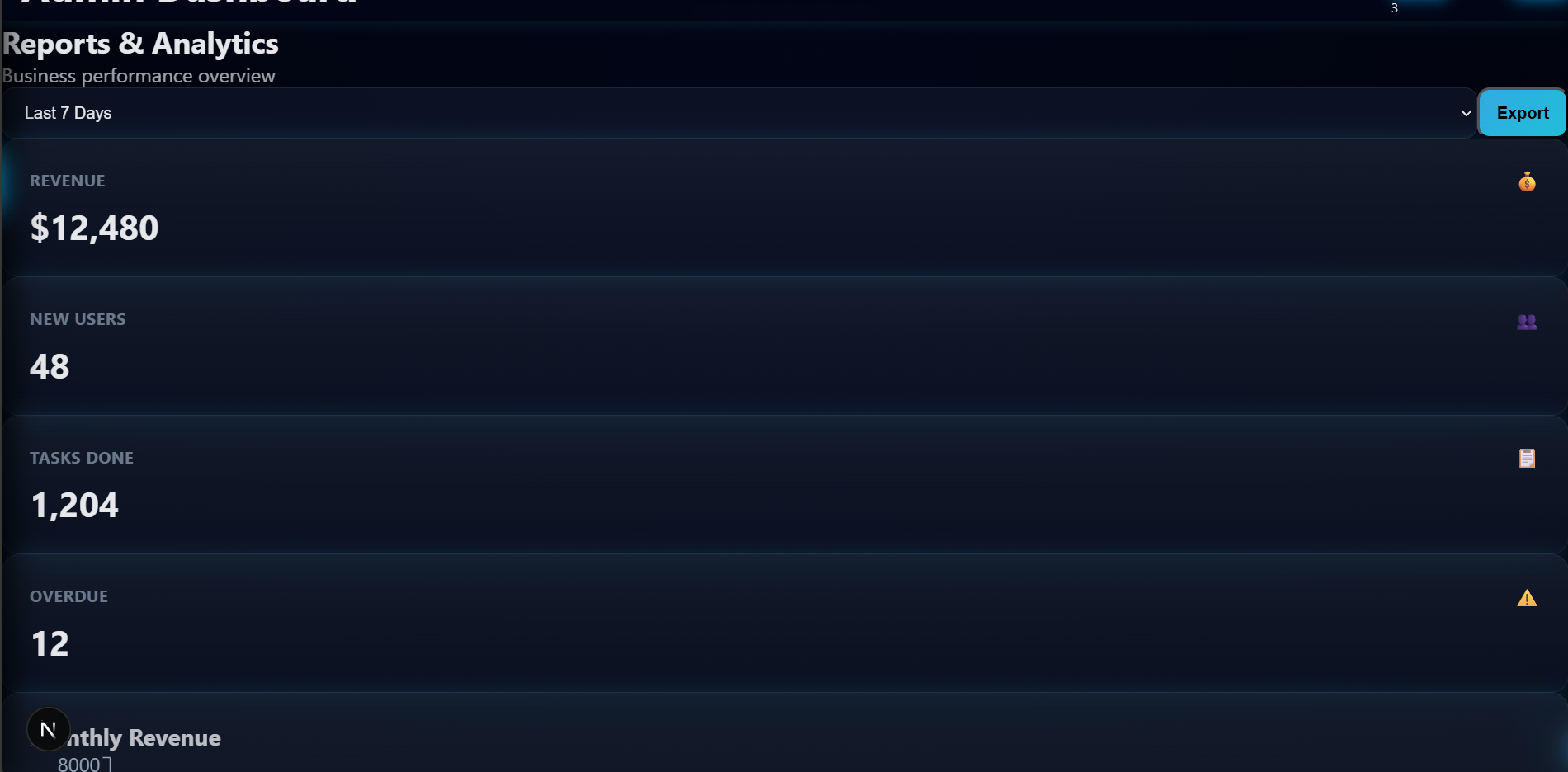 A centralized web-based platform designed to help organizations manage employees, tasks, reports, and performance through a secure admin dashboard.